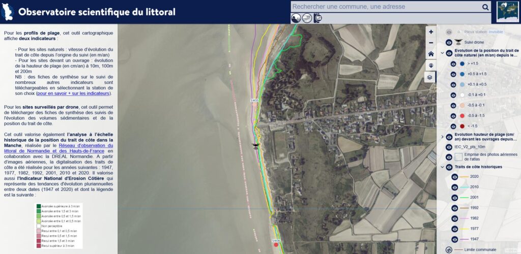 L’outil « comparateur d’images » permet de comparer la 1ère image prise au lancement de la station à l’été 2024, avec la dernière vue valorisée sur le site. Cet outil est idéal pour mettre en évidence les différences ou similitudes dans les photos et ainsi mieux comprendre l’évolution morpho-sédimentaire du site.