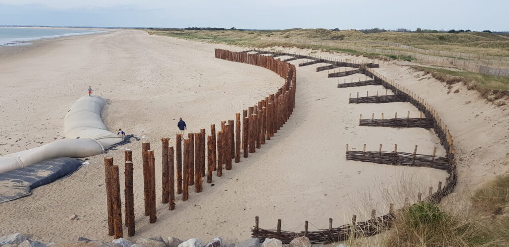 – la poqse de pieux hydrauliques et de fascines au niveau de l’encoche d’érosion, au nord de l’épi en T (2022)