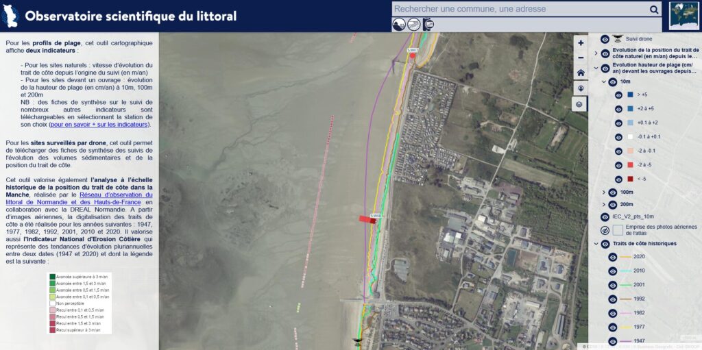 L’analyse diachronique des évolutions du trait de côte (entre 1947 et 2020), montre qu’entre l’épi géotextile au nord et la cale de la rue de la Mer au sud, l’érosion est généralisée depuis 1947 avec des taux de recul de l’ordre de -2m/an.