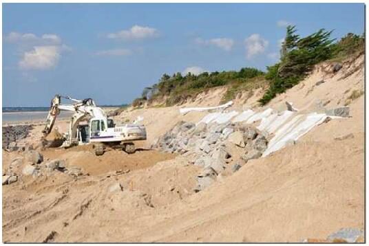– 2011 : Le trait de côte continuant à reculer, réalisation de travaux de déplacement d’enrochements en pied de dune sur 80m, au nord de la dune des Garennes