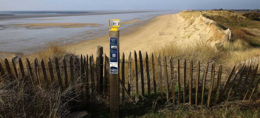 La station CoastSnap de Pirou est installée à l’extrémité nord de la « digue promenade » de Pirou-Plage, sur le haut de la dune.