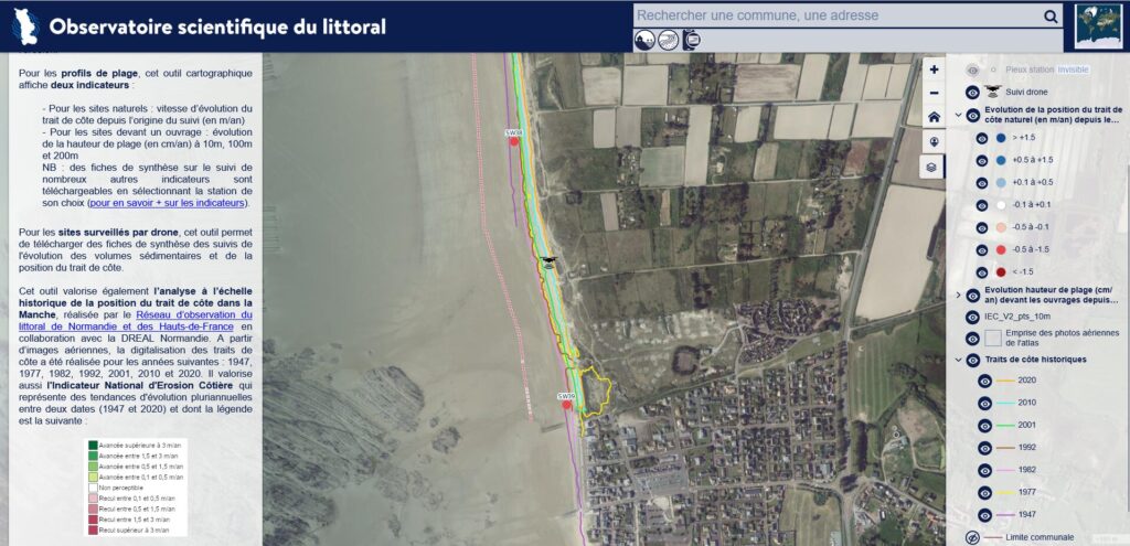 L’outil « comparateur d’images » permet de comparer la 1ère image prise au lancement de la station à l’été 2024, avec la dernière vue valorisée sur le site. Cet outil est idéal pour mettre en évidence les différences ou similitudes dans les photos et ainsi mieux comprendre l’évolution morpho-sédimentaire du site.