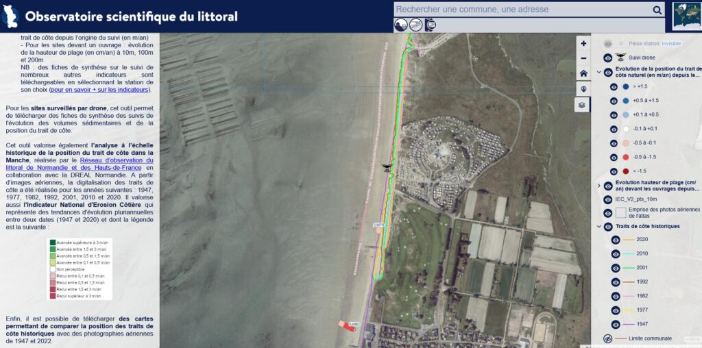 L’outil « comparateur d’images » permet de comparer la 1ère image prise au lancement de la station à l’été 2024, avec la dernière vue valorisée sur le site. Cet outil est idéal pour mettre en évidence les différences ou similitudes dans les photos et ainsi mieux comprendre l’évolution morpho-sédimentaire du site.