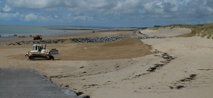 – en juillet-septembre 2019 : des rechargement en sable du haut de plage (15000 m3 pour le secteur sud devant le golf, puis 12800 m3 sur le secteur nord devant le camping de la Vanlée)