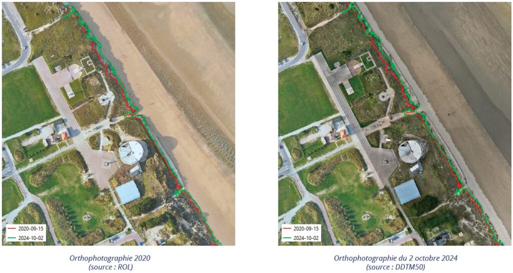 Le suivi par drone réalisé par la DDTM de la Manche (depuis 2020), met en évidence un bilan positif entre 2020 et 2023, puis négatif de 2023 à 2024. La migration des barres sableuses explique en partie l’alternance érosion / accrétion observée. L’érosion dunaire sur cette partie nord semble s’être stabilisée au cours de la période estivale 2024.