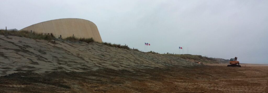 – en 2022 : un rechargement de plage de 7000 m3 au droit du musée (entretien des rechargements précédents) et des monuments américains (nouveau rechargement), et la pose de ganivelles pour conforter cette dune en érosion (~170m). Le profil de ce rechargement a été réalisé dans le même esprit que le dernier réalisé en 2019, à savoir la création d’une banquette de 10m de large et une pente douce, de 25m vers le large, sur une longueur de 280m, afin d’atténuer l’effet érosif des houles et des grandes marées.