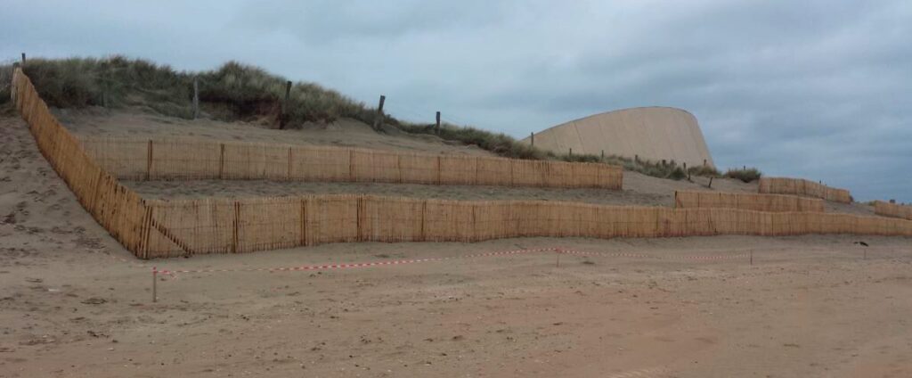 – en 2015 : un confortement dunaire avec un rechargement en sable (2 000 m3), la pose de ganivelles (300ml), la pose de filets coco anti-érosion et la plantation d’oyats (500m²)